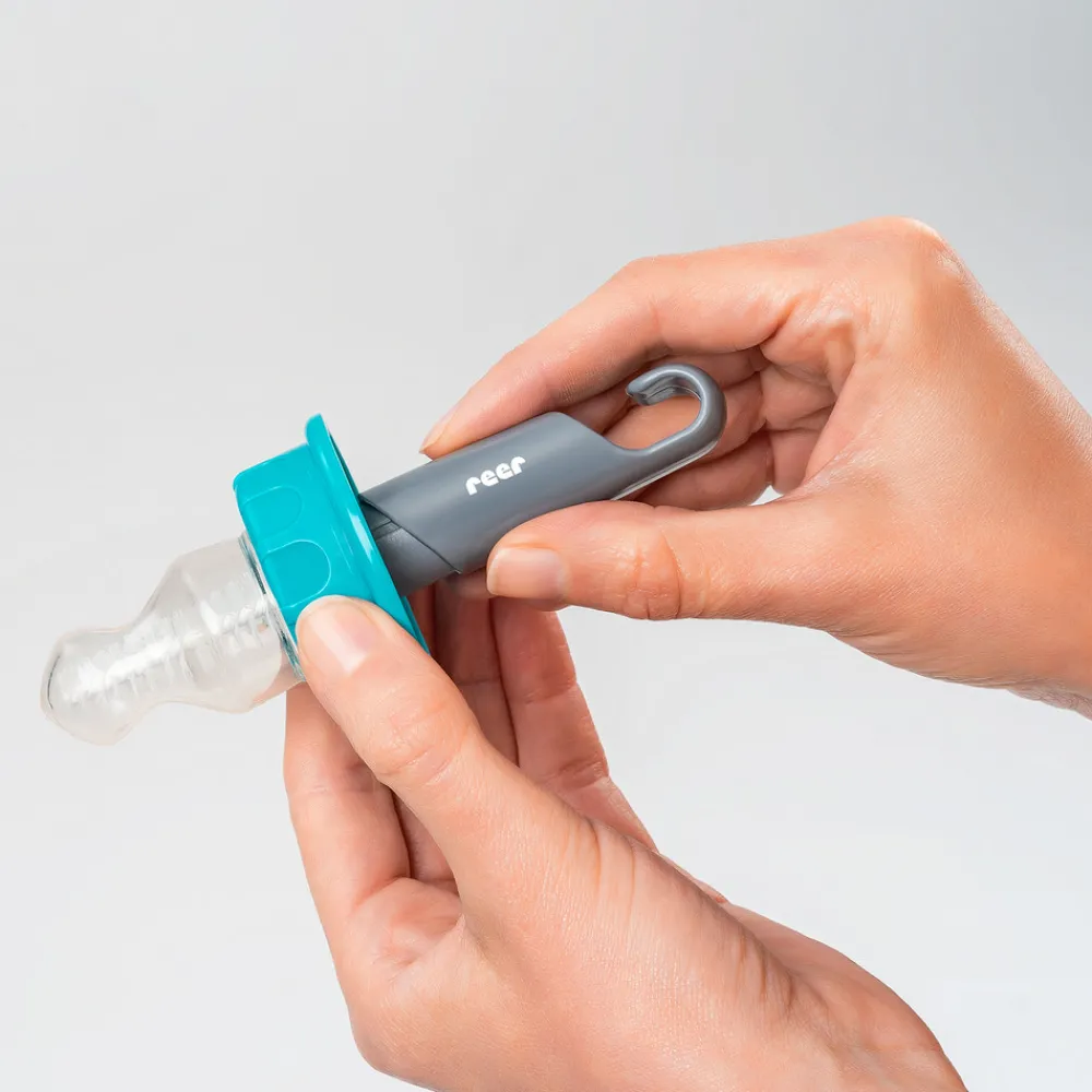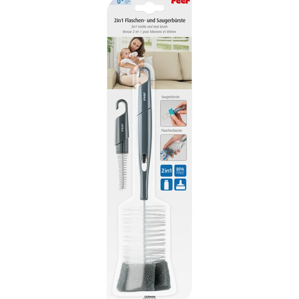 Flaskebørsten har en ekstra børste i toppen af håndtaget som kan bruges til at rengøre sutter.