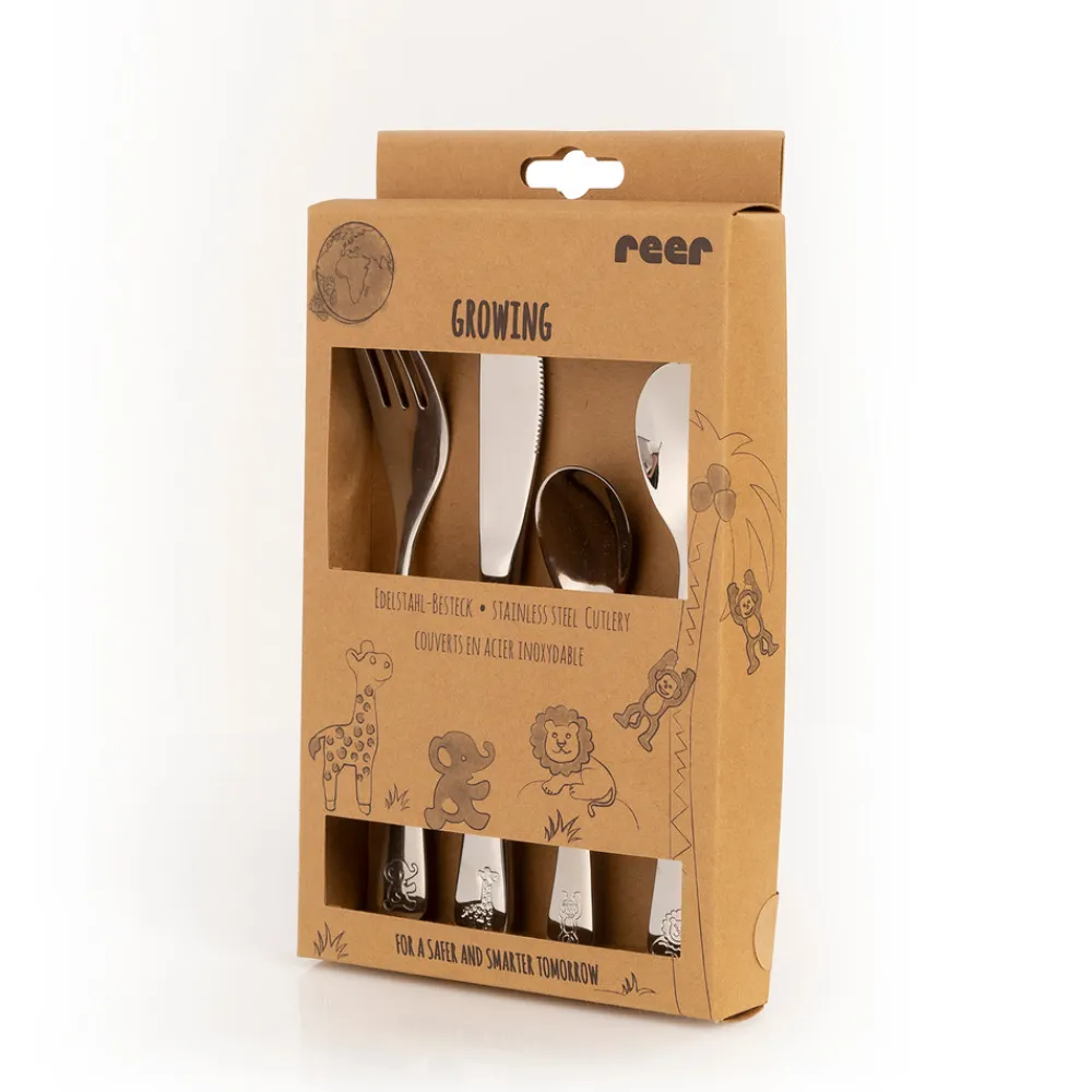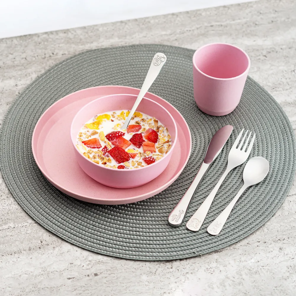 Dette flotte sæt er lavet af rustfrit stål og er formet så det er let for børn at holde om.