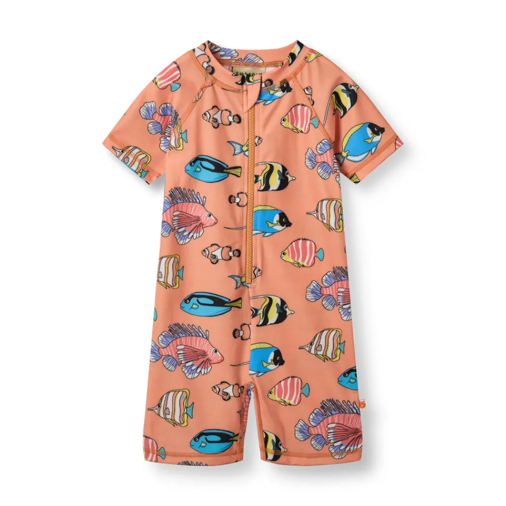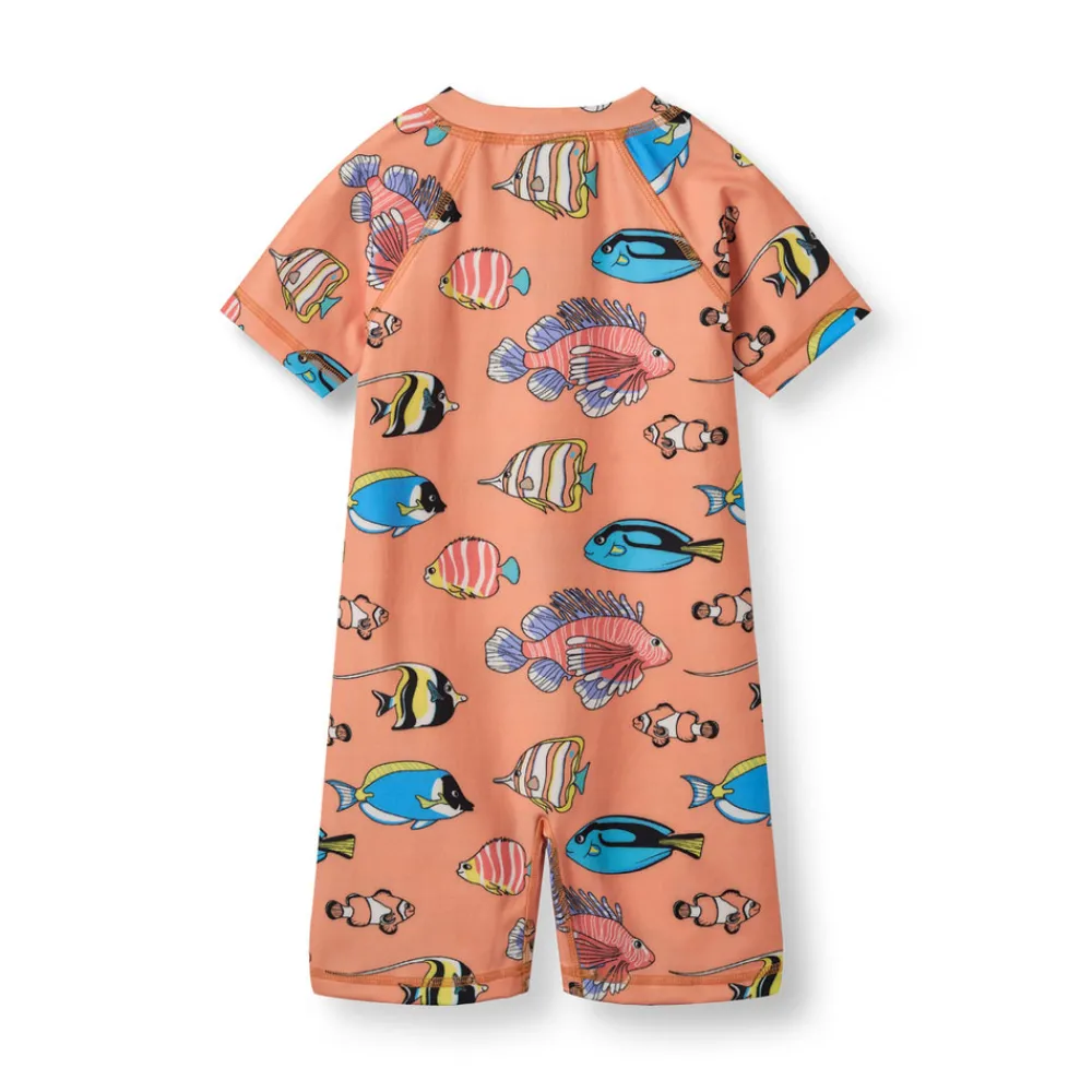 Udforsk havets skønhed med vores legende print med en række farverige fisk, der svømmer sammen i harmoni. Småfolks print er tegnet med fokus på glade farver, detaljer og historier. Vores badetøj er en fantastisk måde at tilføje personlighed til dit barns garderobe, samtidig med at dit barn kan føle sig komfortabel hele dagen.