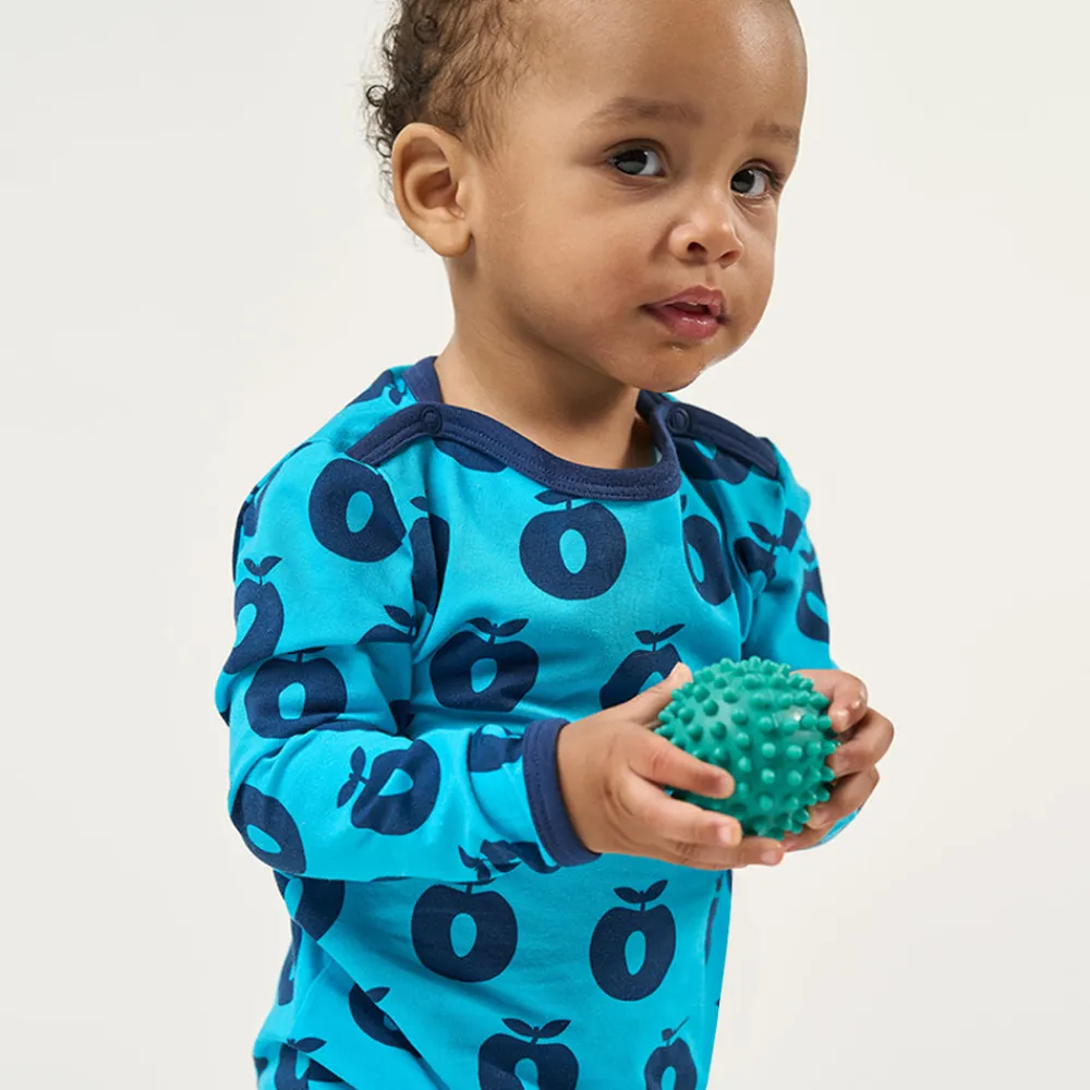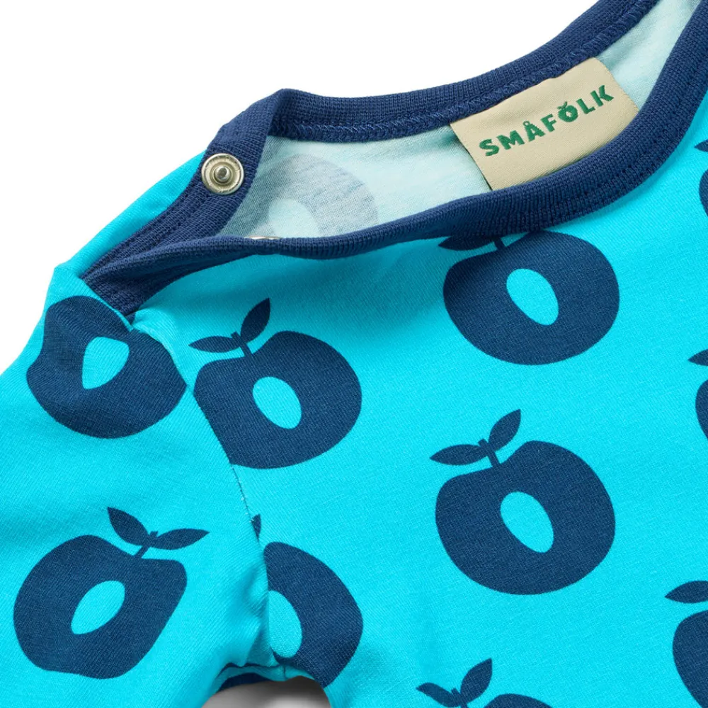 Langærmet baby body med æbler produceret i en økologisk og strækbar bomuldsjersey. Denne body er OEKO-TEX Standard 100® certificeret, hvilket betyder at denne body er produceret og testet for skadelige stoffer, så du kan passe på dit barns hud og helbred.Denne body har en normal pasform med kuvertlukning og trykknapper, samt ribkant i hals og ærmer. Småfolks body’er er designet i Danmark med tanke på at kunne holde til utallige eventyrer og leg, og bevare form og farver selv efter gentagen brug.