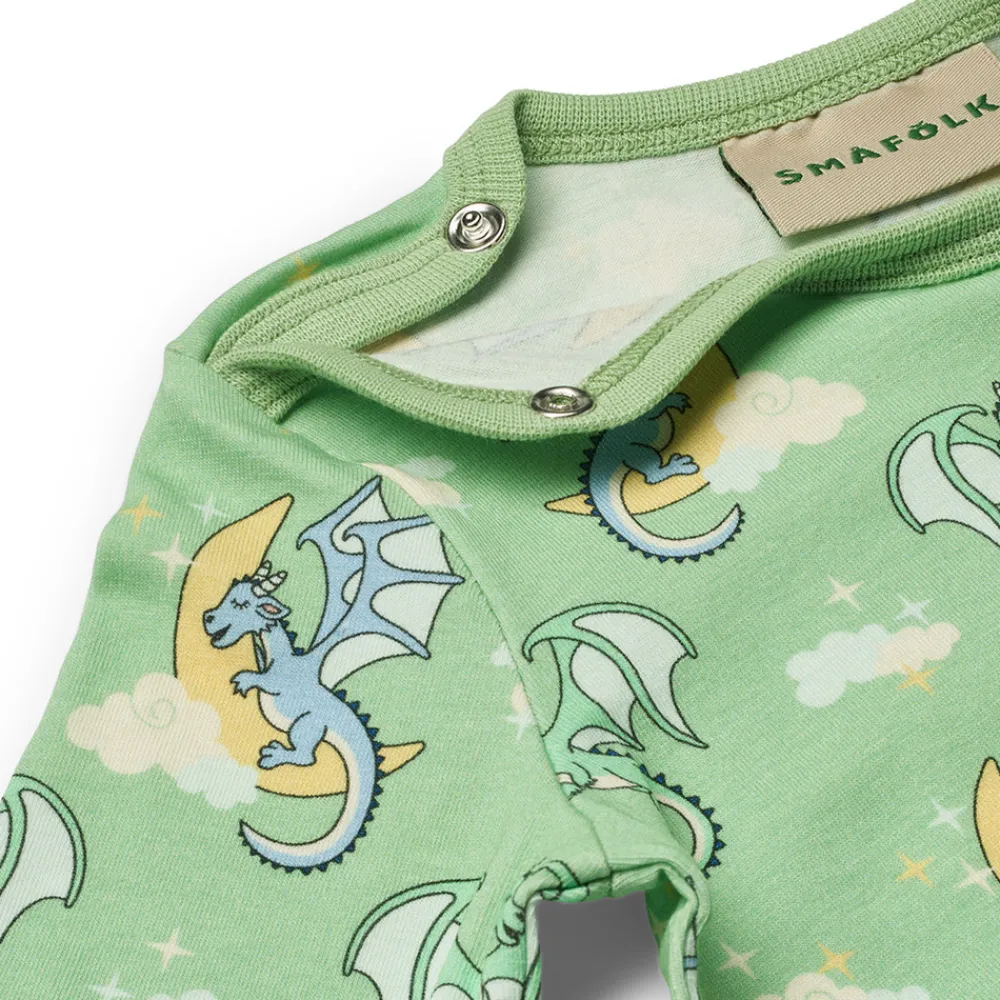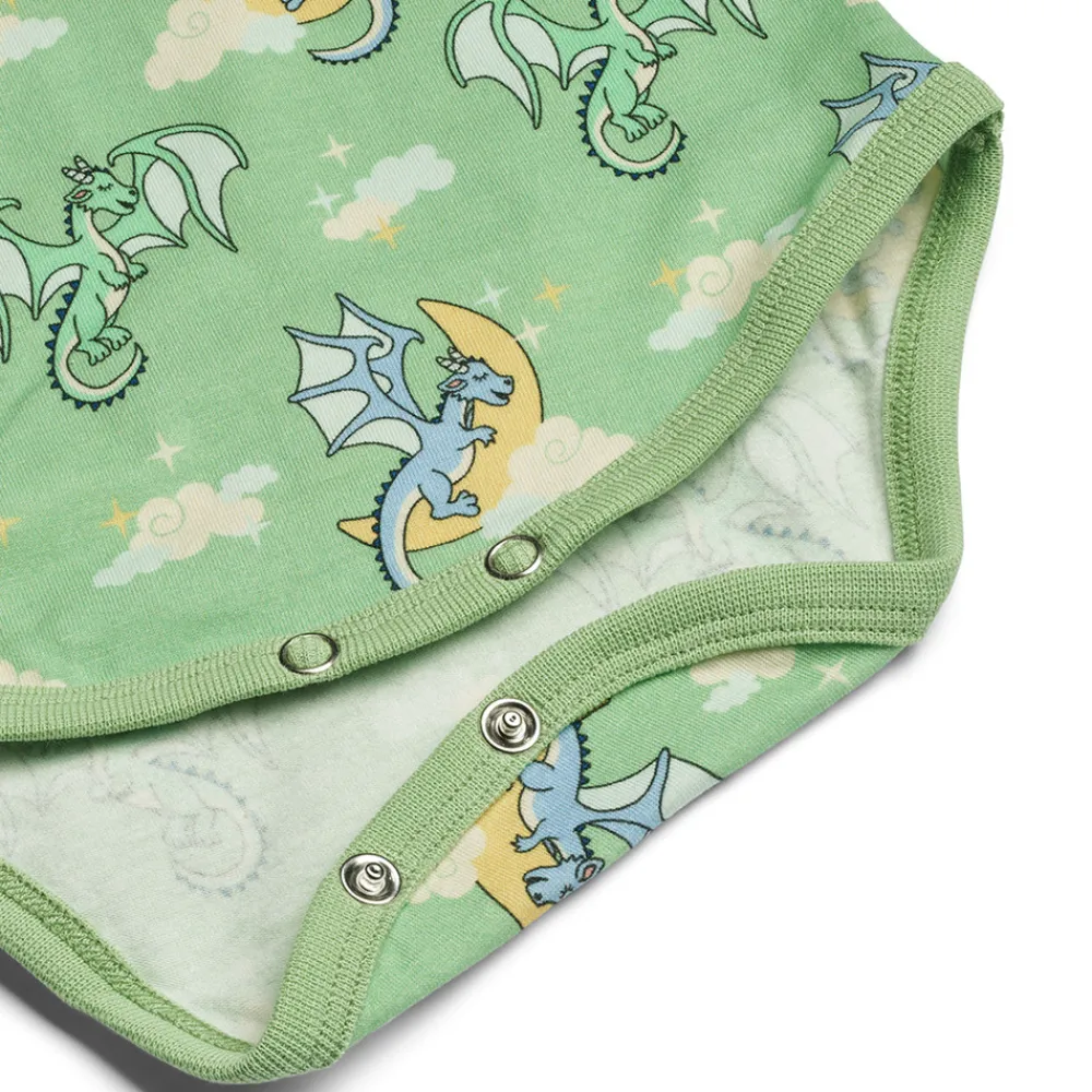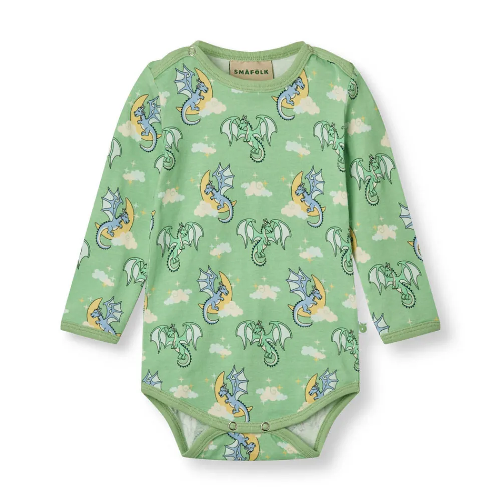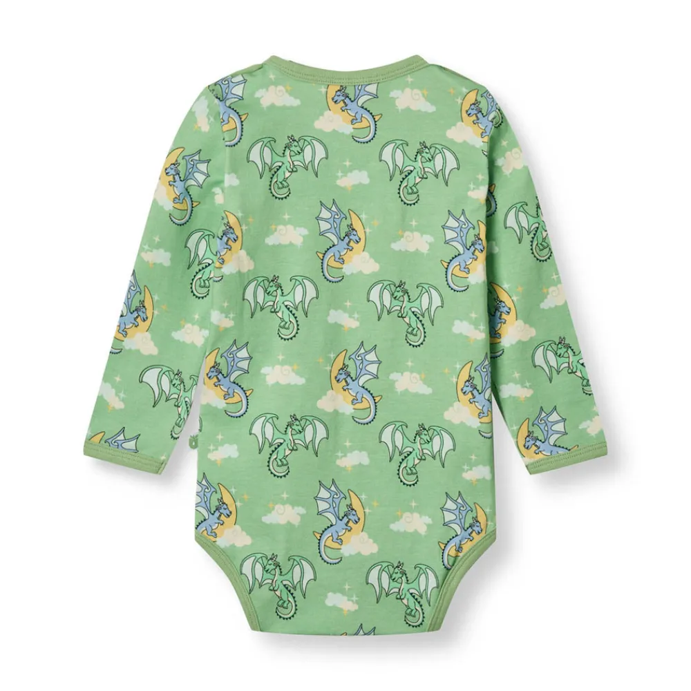 Langærmet baby body med sovende drager produceret i en økologisk og strækbar bomuldsjersey. Denne body har en normal pasform med kuvertlukning og trykknapper, samt ribkant i hals og ærmer.