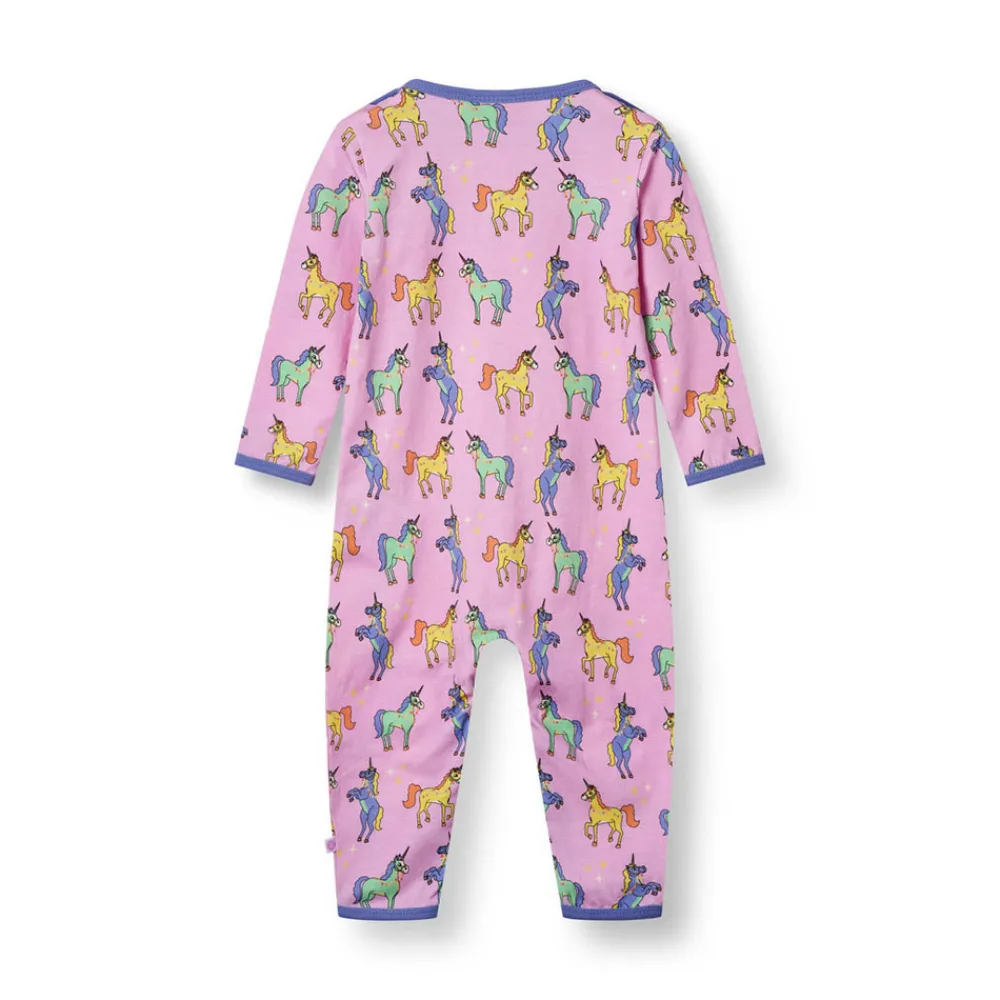 Heldragt til baby med enhjørninger, produceret i en økologisk og strækbar bomuldsjersey. Heldragten har en normal pasform med kuvertlukning og trykknapper, samt ribkant i hals og ærmer.