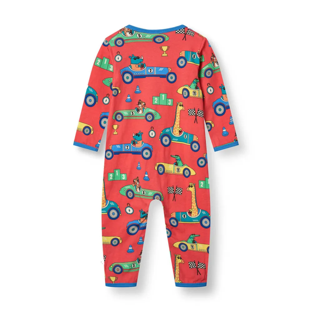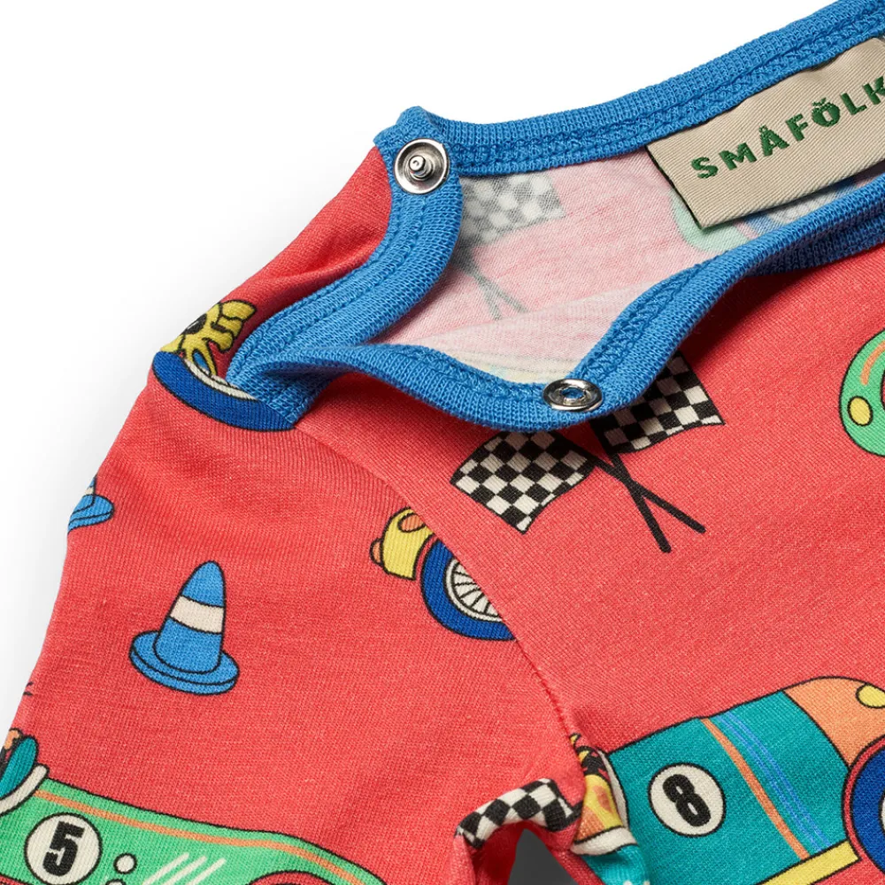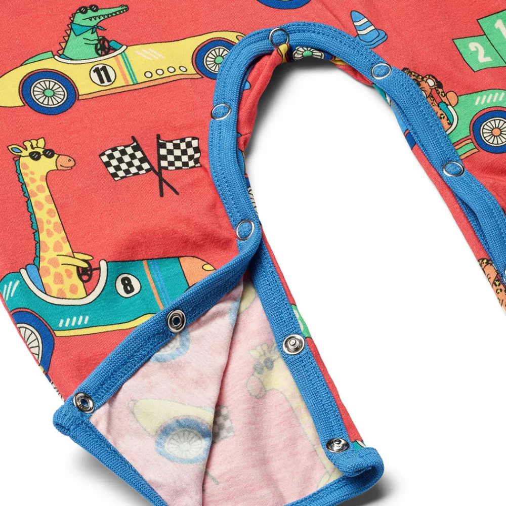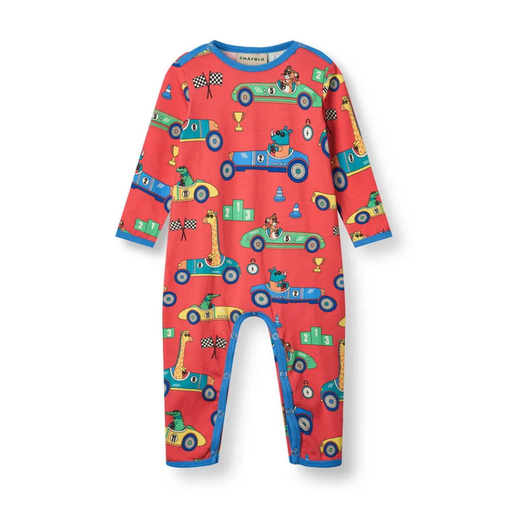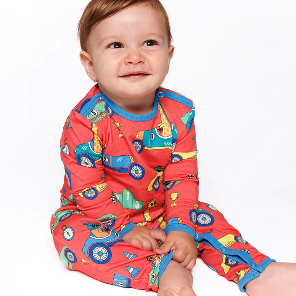 Heldragt til baby med racerbiler, produceret i en økologisk og strækbar bomuldsjersey. Heldragten har en normal pasform med kuvertlukning og trykknapper, samt ribkant i hals og ærmer.