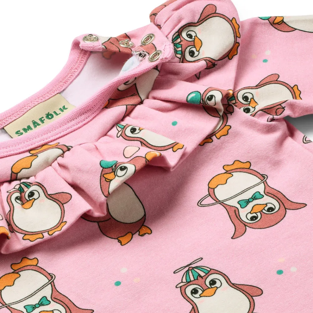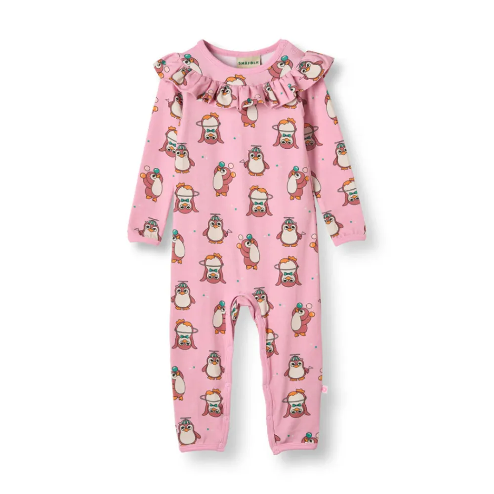 Lad legesyge cirkuspingviner tilføje et strejf af lune og charme til din babys outfit. Småfolks print er håndtegnede og designet med fokus på glade farver, detaljer og historier. Vores babydragter er en fantastisk måde at tilføje personlighed til dit barns garderobe, samtidig med at dit barn holder sig komfortabelt hele dagen.