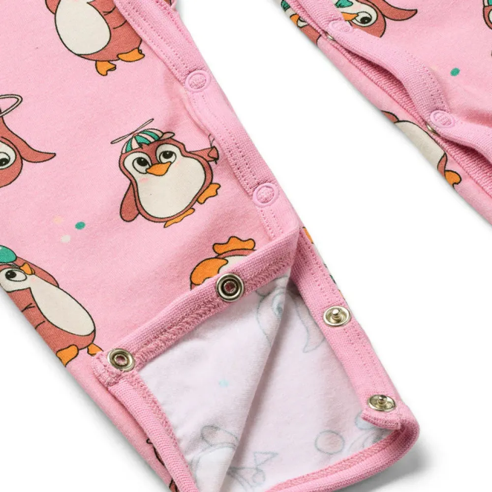 Babybody med søde pingviner, fremstillet af økologisk, strækbar bomuldsjersey for maksimal komfort. Denne OEKO-TEX Standard 100®-certificerede babydragt er produceret og testet fri for skadelige stoffer, hvilket sikrer, at den er sikker for dit barns hud.