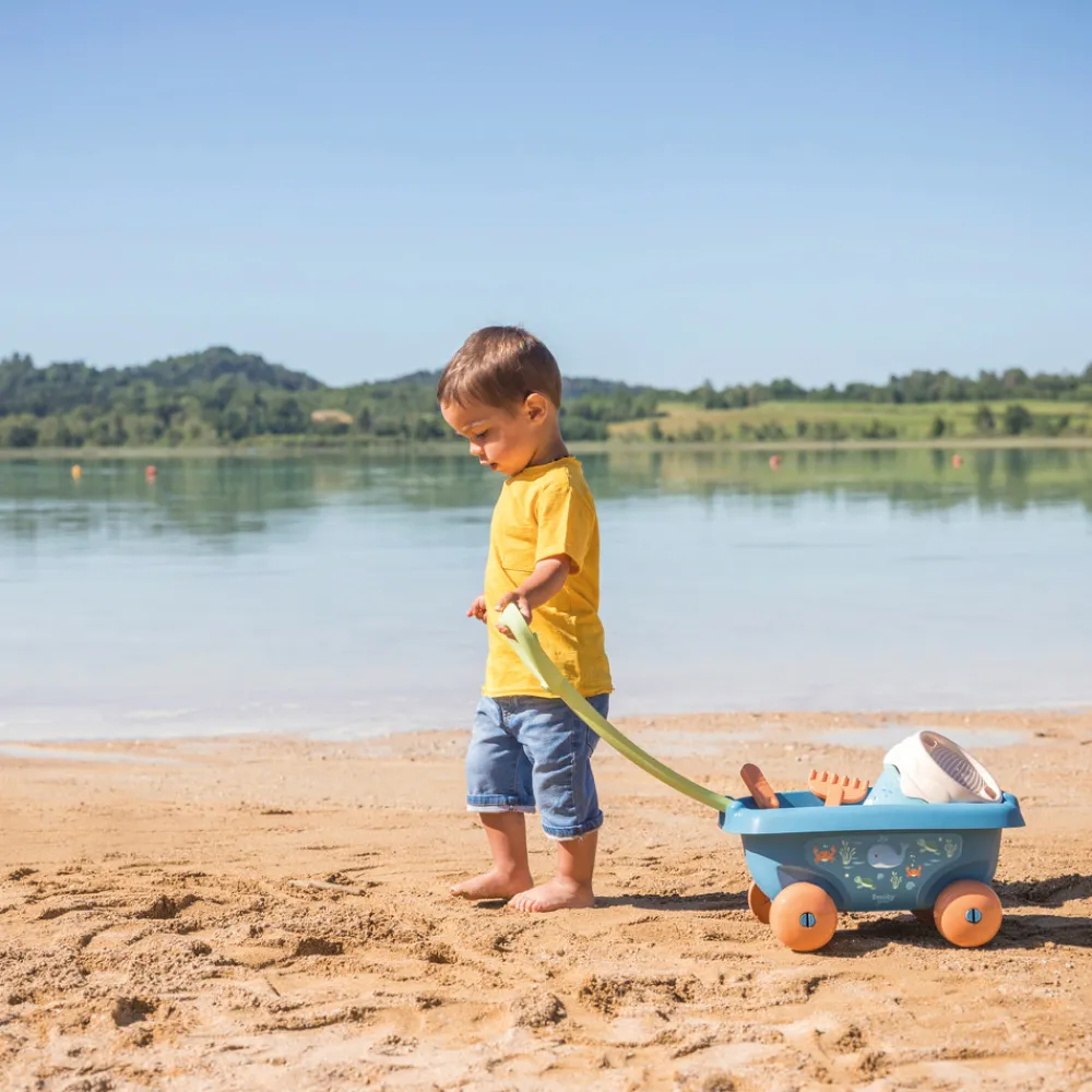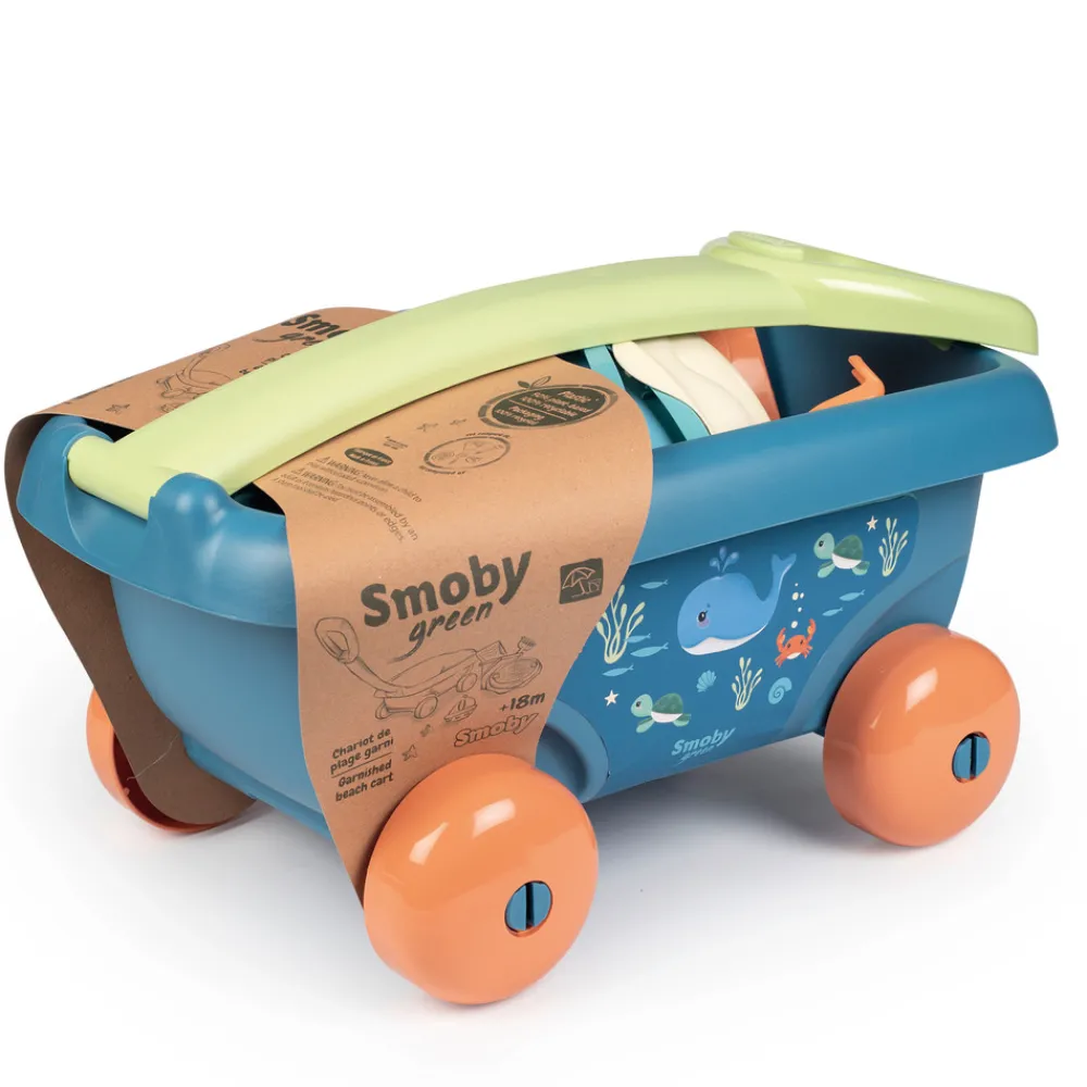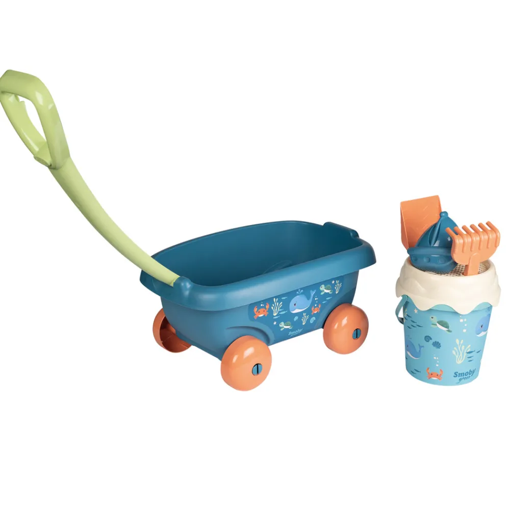 Little Smoby Green trækvogn med spandsæt i naturlige farver og søde motiver. Inkluderer trækvogn, spand, si, sandform, spade og rive. Lavet af sukkerrør. 44x 27 x 24 cm. Fra 18 måneder.