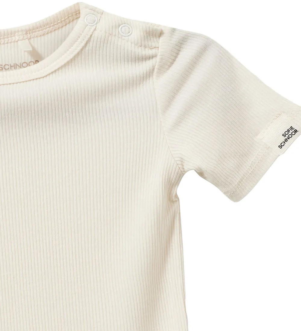 Enkel moderne body i ribbet stof af lækker kvaltit. Trykknapper ved skulderne for nemmere at få af og på, og ligeledes mellem benene for lettere bleskift.