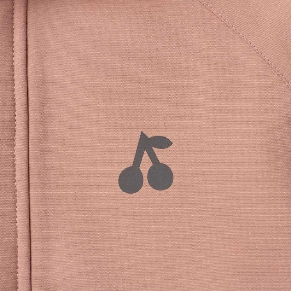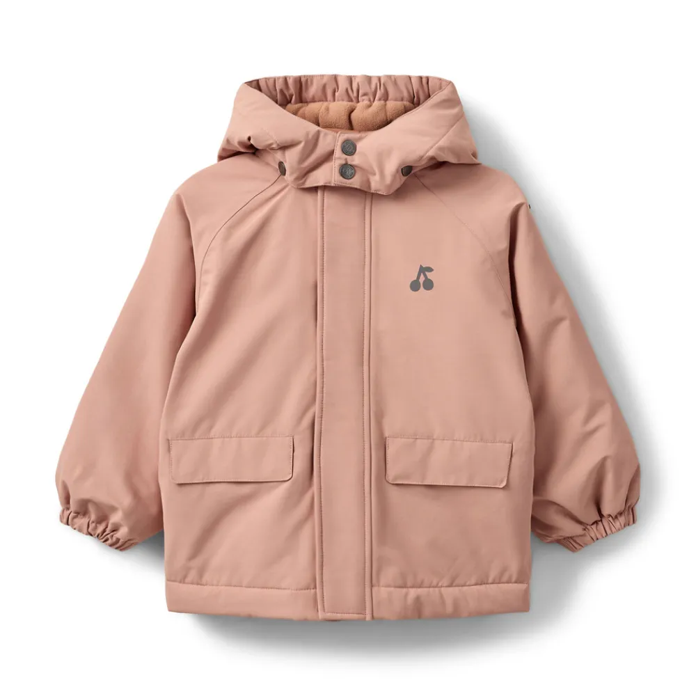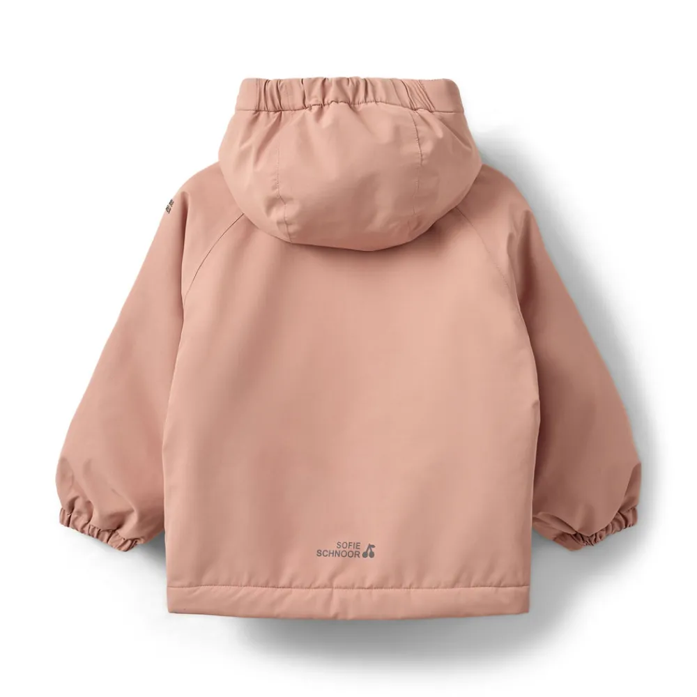 Jakke i rosy brown, med hætte, 2 lommer foran og elastik i ærmerne.