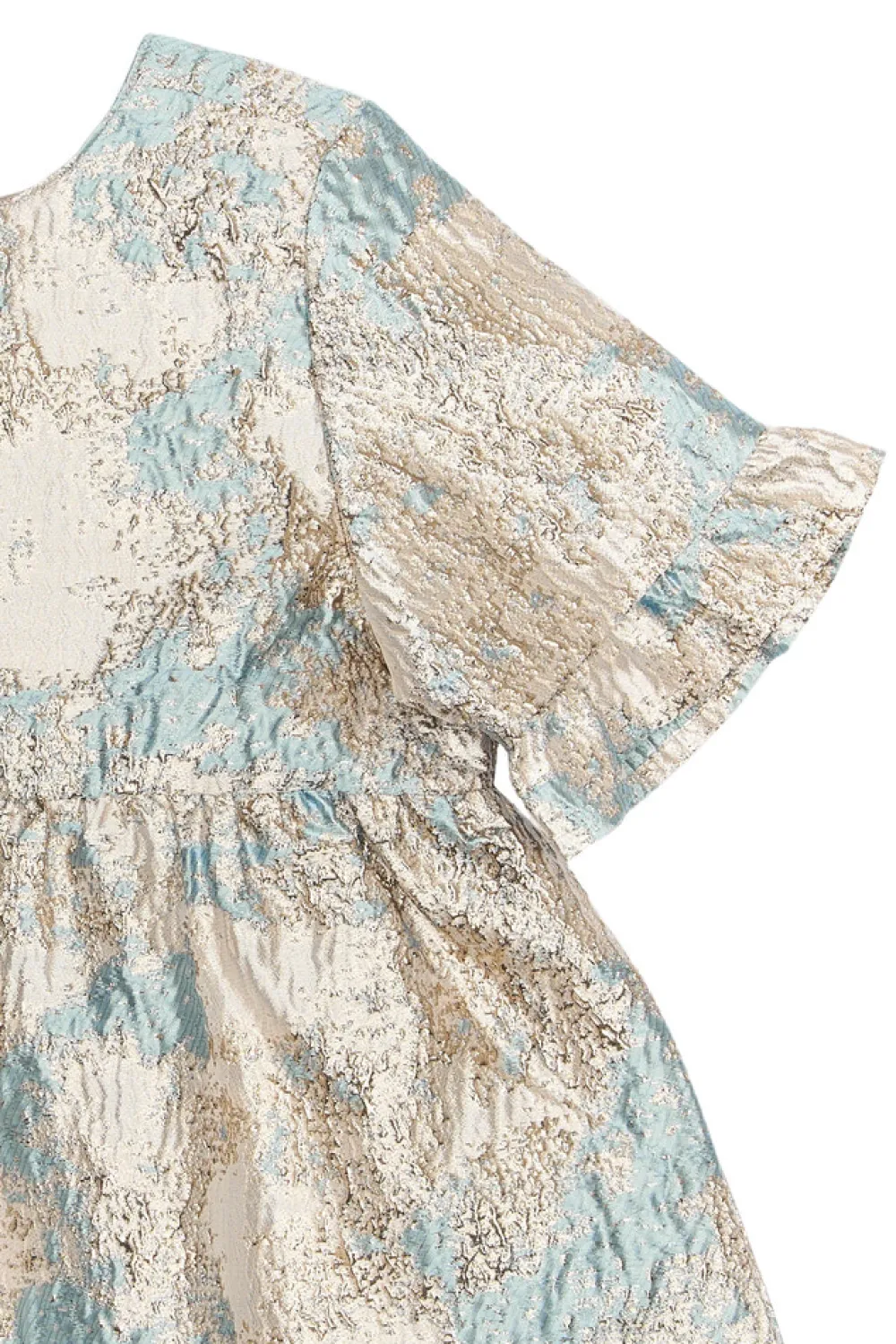 Denne kjole fra THE NEW Siblings er et virkelig elegant stykke, perfekt til specielle lejligheder. Fremstillet af et smukt jacquardstof med et glitrende blomstermønster, den har en blusset silhuet med blød volumen og flagrende ærmer, der tilføjer et raffineret og festligt præg. Kjolen er både stilfuld og behagelig, så de små kan skinne og lege, mens de stadig kan stråle frit.