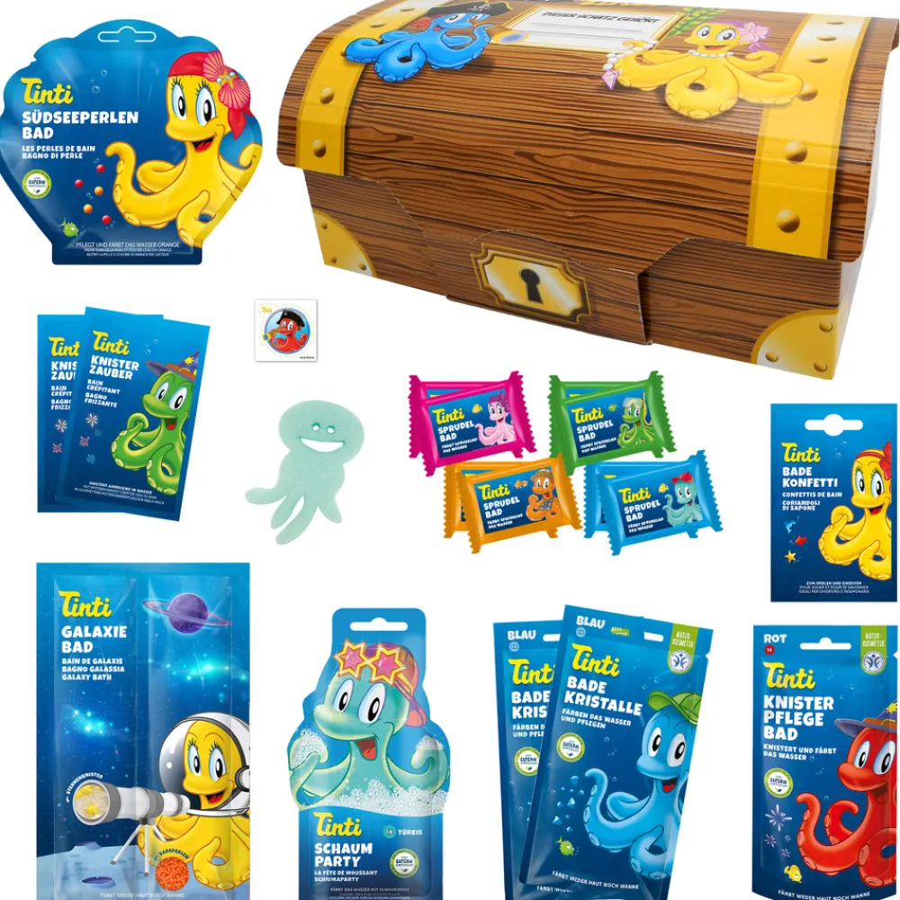 Skattekisten indeholder hele 19 produkter. I skattekisten er der: en badesvamp, et sjovt klistermærke, to knitrebade, otte små badebomber, et rødt knitrebad, to gange blå badekrystaller, en gang sydhavsperler, en gang galaksebad, et blåt skumbad samt en omgang badekonfetti. Billedet kan dog variere lidt fra det endelige indhold.