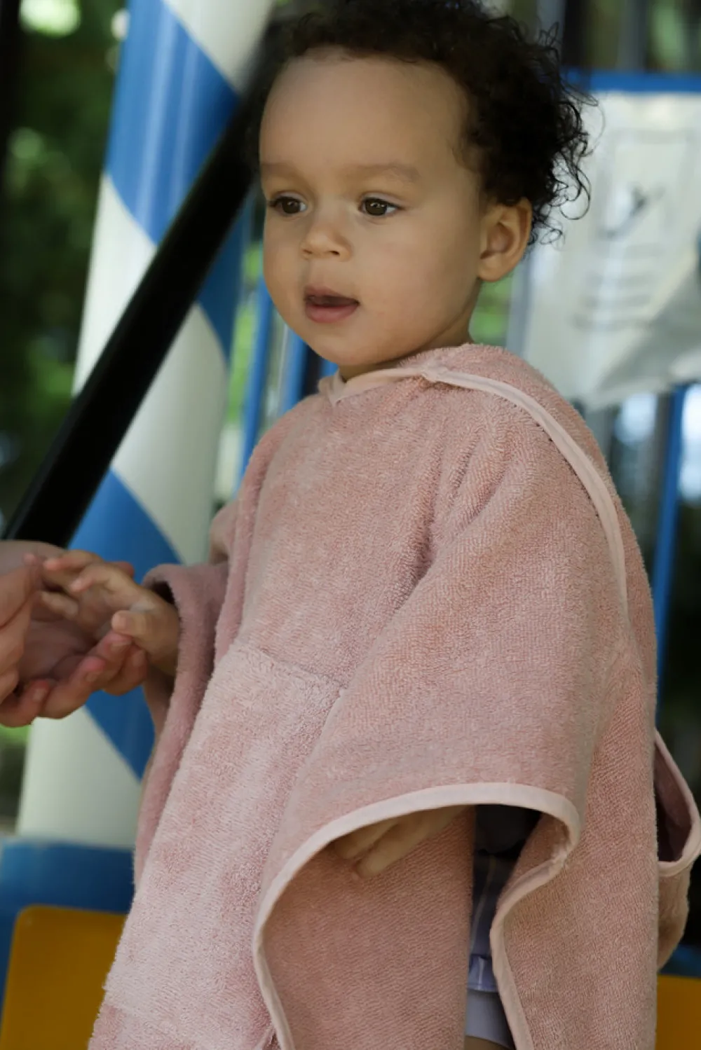 Super blød poncho med fin pom-pom og hætte i douce farve som barnet kan svøbe sig ind i. Ponchoen er i den blødeste frottébomuld med perfekt absorberingsevne fremstillet af 100% Oeko-Tex certificeret bomuld. Perfekt til efter badet, svømmehallen eller en hyggelig sommerdag på stranden.