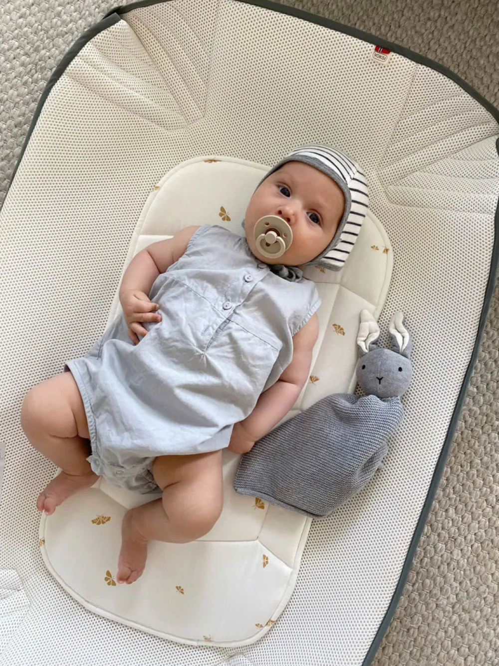 Sørg altid for at placere Carry Me på et fladt underlag, så barnet ikke ruller ud. Dette produkt opfylder de opdaterede krav i den europæiske standard EN 1466:2023 med hensyn til sikkerhed. Efterlad aldrig baby uden opsyn. Det anbefales ikke at bruge dette produkt til samsovning. Læs og følg altid instruktionerne for korrekt brug og advarsler på produktet.
