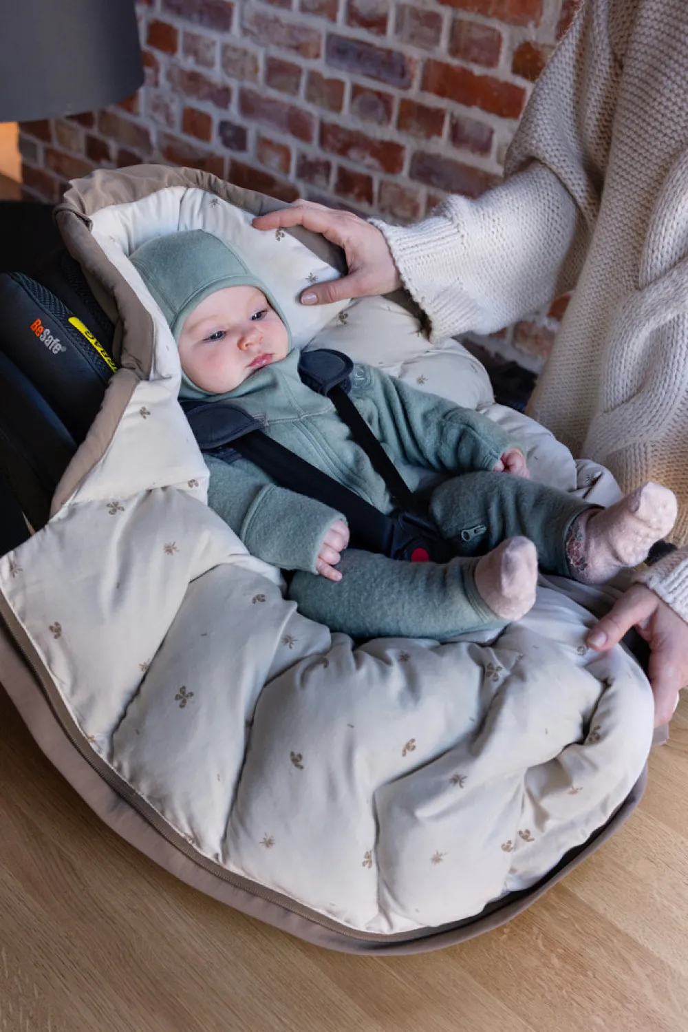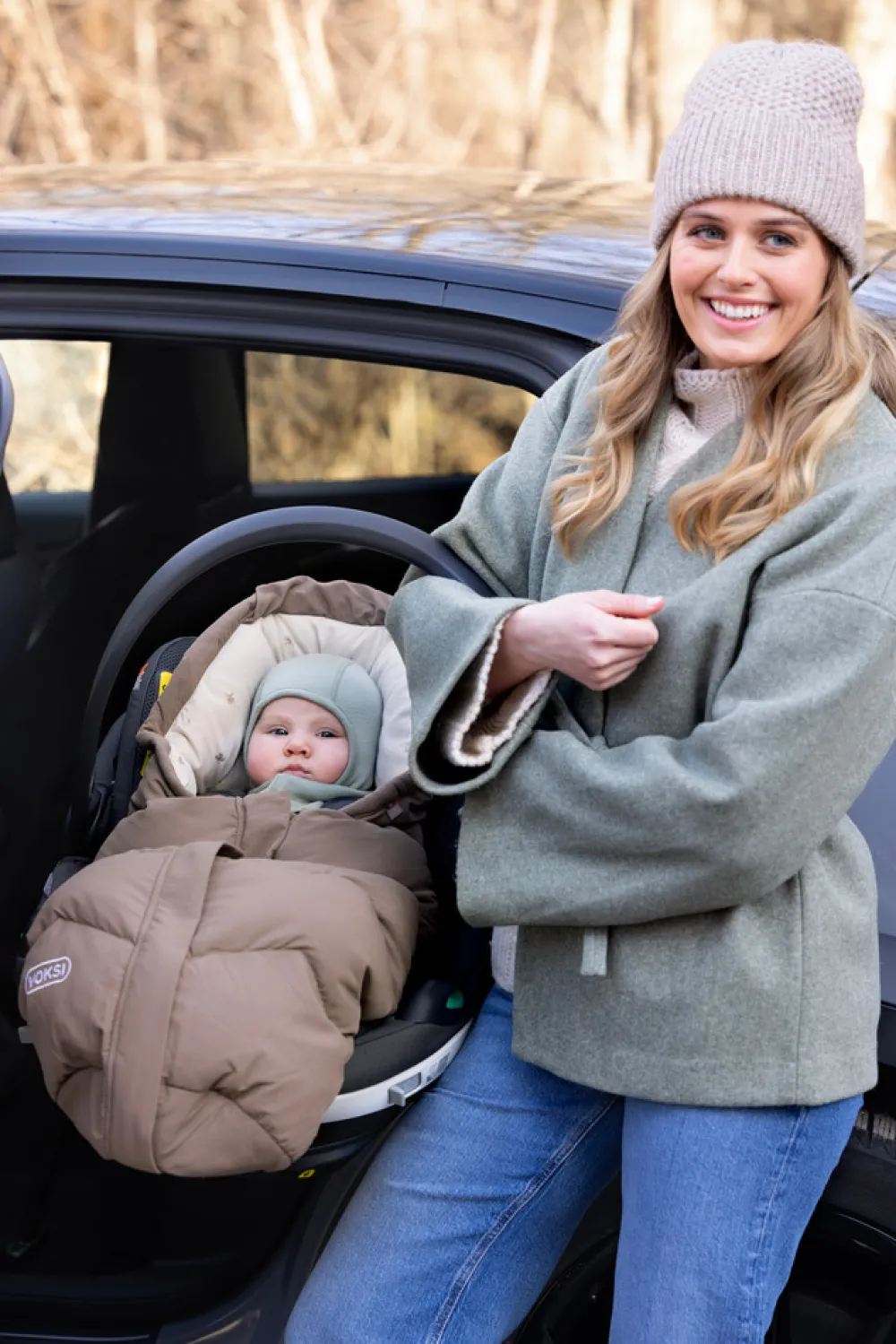 I en autostol er det vigtigt, at barnet er korrekt fastspændt, og at selen er spændt korrekt. Når Voksi Move bruges i en autostol, giver den isolering, der erstatter overtøj. På denne måde kan selen i autostolen sidde tættere på barnets krop, end hvis det havde isolerende tøj, der dækkede skuldre og overkrop. En centreret lynlås med hurtigudløser foran giver nem adgang til barnet i autostolen. Det unikke design af ryggen med åbninger til selen sikrer nem installation og god tilpasning til selen. Trykknap i ryggen for nem justering af længden. Når temperaturen stiger i bilen, er det nemt at åbne posen helt, så babyen ikke bliver for varm og får ventilation i autostolen.