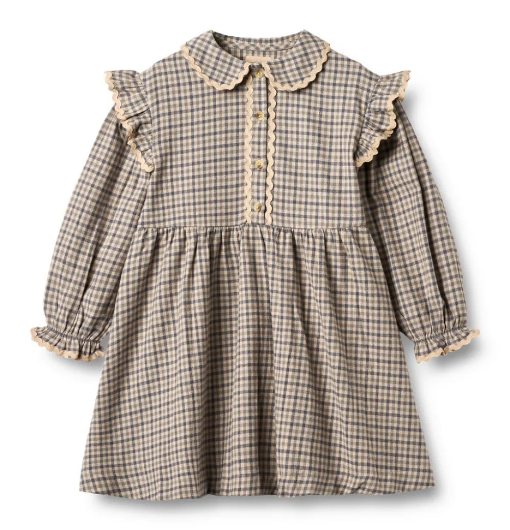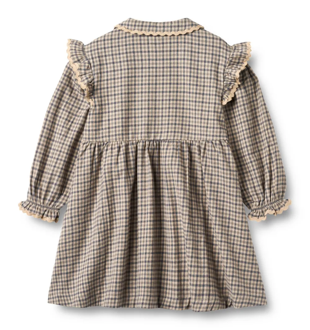 Langærmet kjole i blødt, vævet økologisk bomuld til børn. Wheats fine kjole har en løs pasform, der gør den både let og behagelig for dit barn at have på. Skæringen i taljen giver kjolen en smuk volumen i skørtet, som tilføjer ekstra charme. Den er ideel til de køligere efterårs- og vintermåneder og kan nemt styles med leggings og en cardigan eller strik for et fuldendt lag-på-lag look.