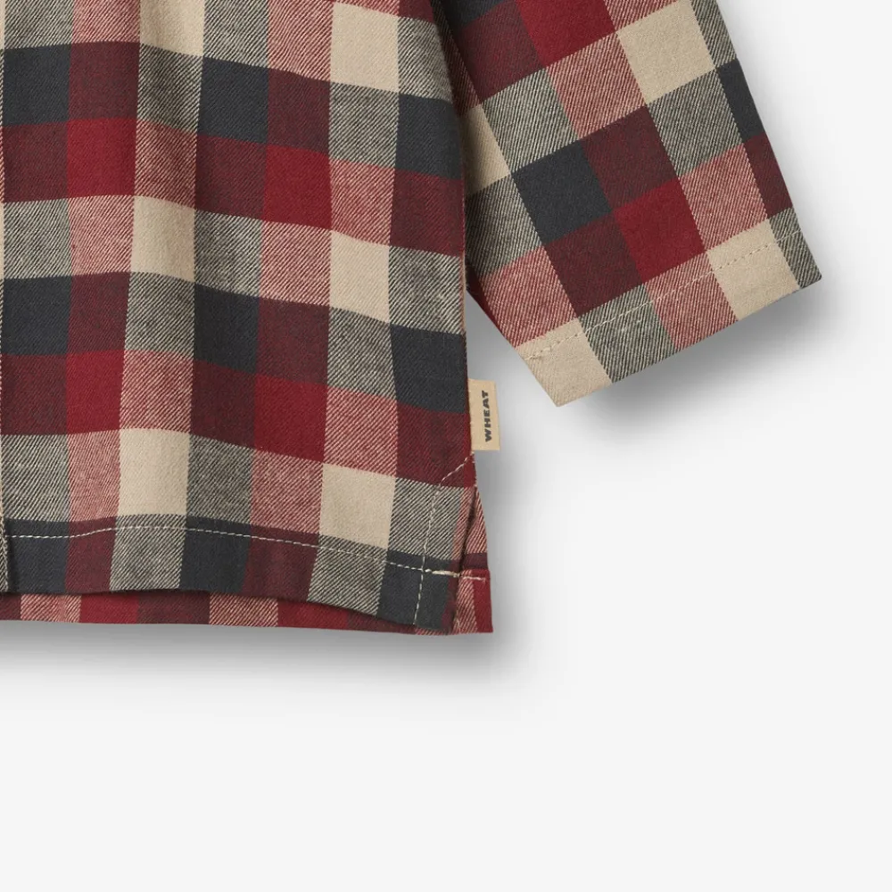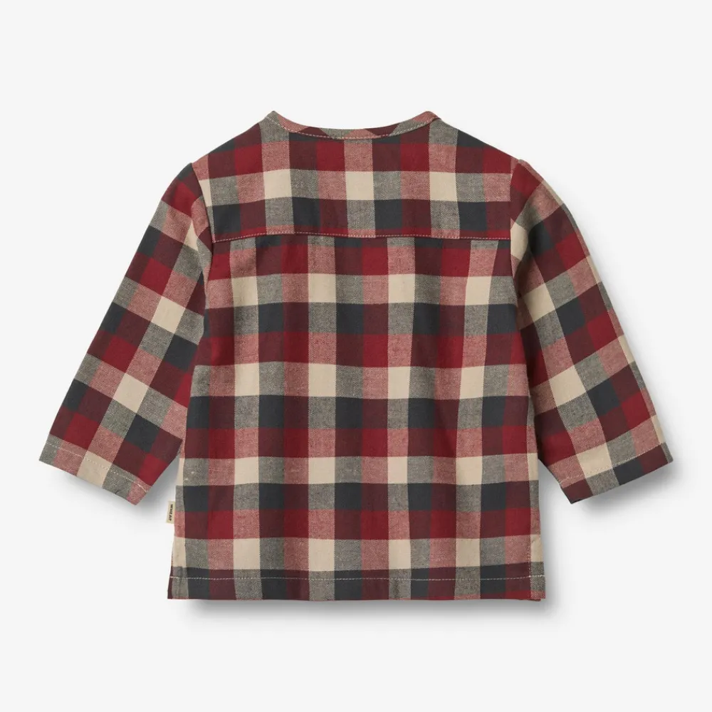 Langærmet ternet skjorte uden krave i blødt økologisk bomuld til baby. Denne klassiske skjorte med mandarinkrave er som skabt til julens festligheder. Det tidløse design gør den både elegant og behagelig – perfekt til julemiddage og hyggelige sammenkomster. Style den med et par bukser eller under en strikvest for et ekstra festligt look, der emmer af julens magi.