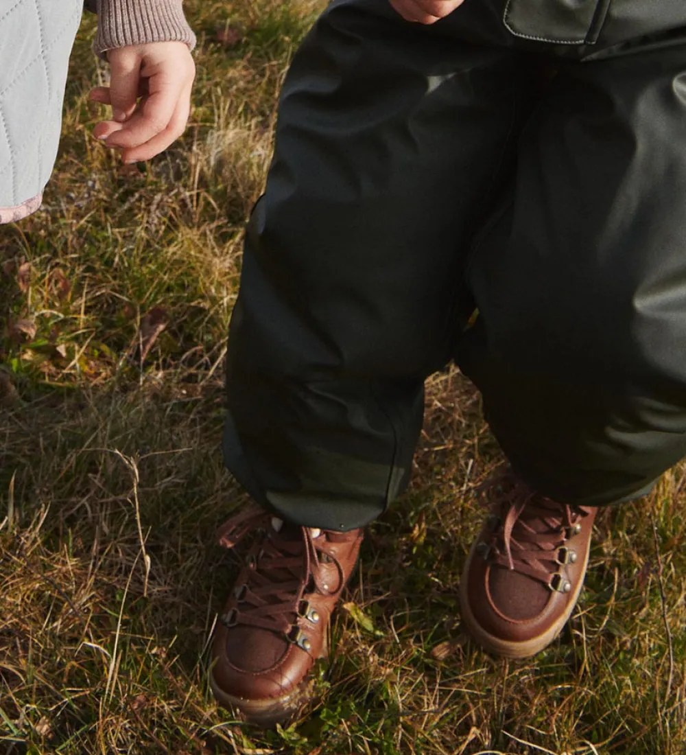 Lækre vinterstøvler fra Wheat i brunt skind med fine detaljer i matchende ruskind, inspireret af det klassiske vandrestøvle-look. Støvlerne lukkes med snørebånd og har en praktisk lynlås langs indersiden af skaftet, som gør dem nemme at få af og på. Indvendigt er de foret med blødt, hvidt uld, og de har udtagelige indersåler for ekstra komfort. Den kraftige ydersål i lysebrunt gummi har et skridmønster, der sikrer godt fodfæste på glatte underlag.
